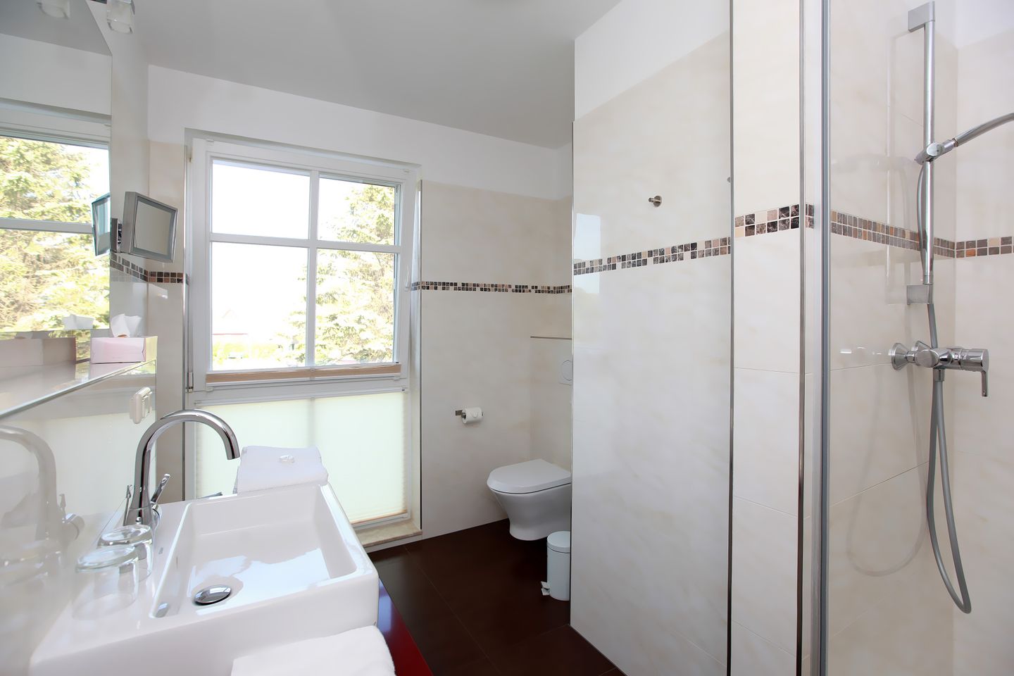 Das Apartment ist hochwertig und voll ausgestattet, hat ein großzügiges Bad mit Fußbodenheizung, Dusche/WC und Fön.