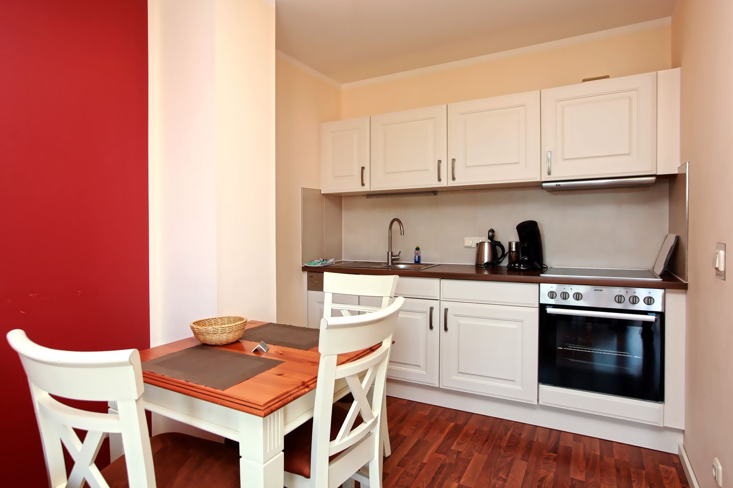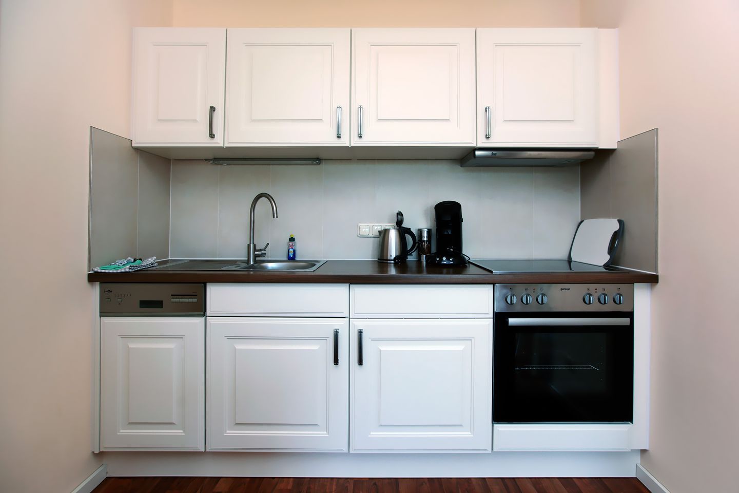 Die hochwertige Einbauküchenzeile ist mit Ceranherd, Backofen, Kühlschrank, Geschirrspüler, Toaster, Teekocher, Kaffeemaschine und Koch- und Essgeschirr