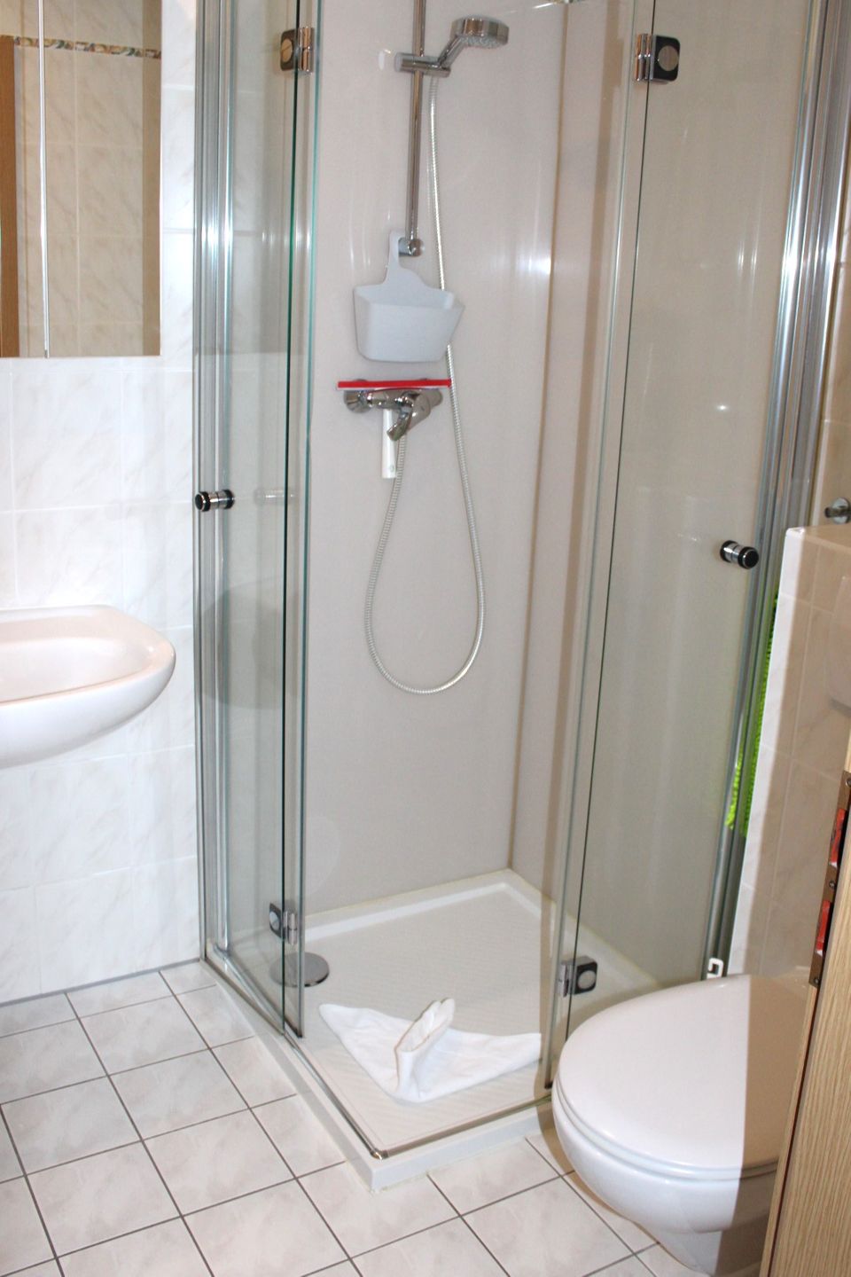 - einen Sanitärraum mit Dusche, WC, Waschbecken