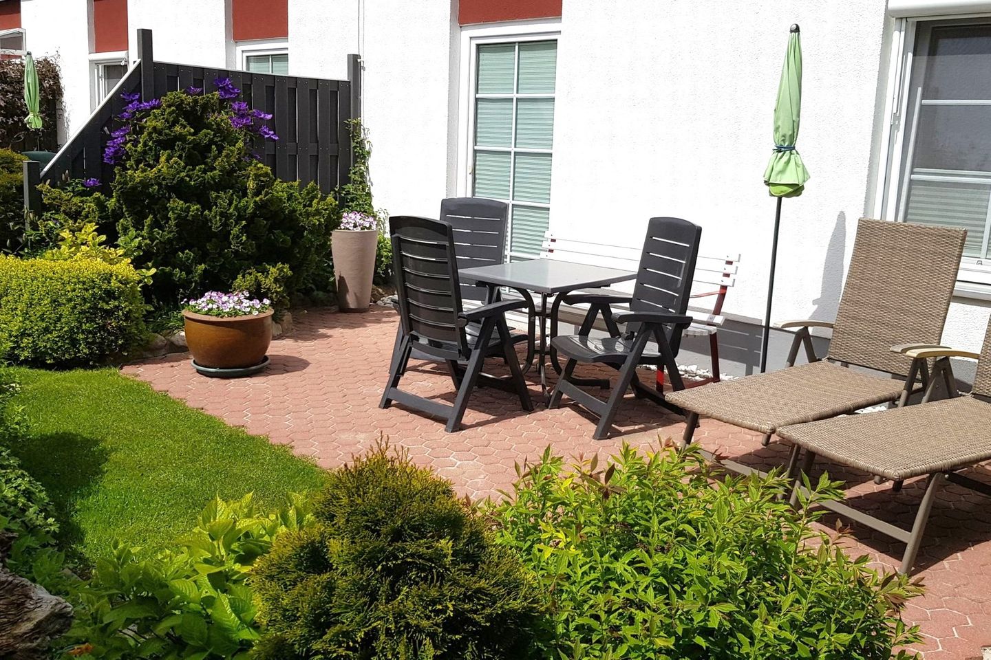 - eine separate Terrasse zur Südseite mit Terrassenmöbeln und Sonnenschirm