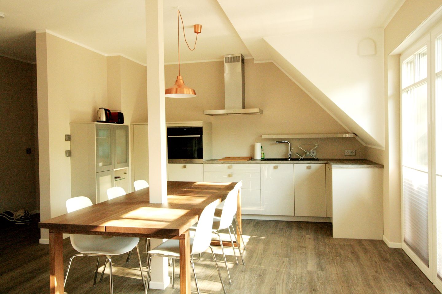 Der offene Wohnraum ist gemütlich und lädt zum chillen ein. Die offene Küche ist modern eingerichtet und bietet mit dem großen Esstisch ausreichend Platz für ein geselliges Beisammensein.