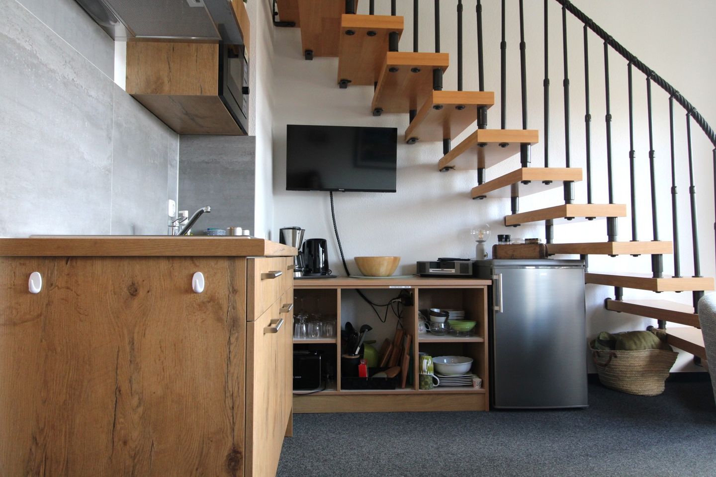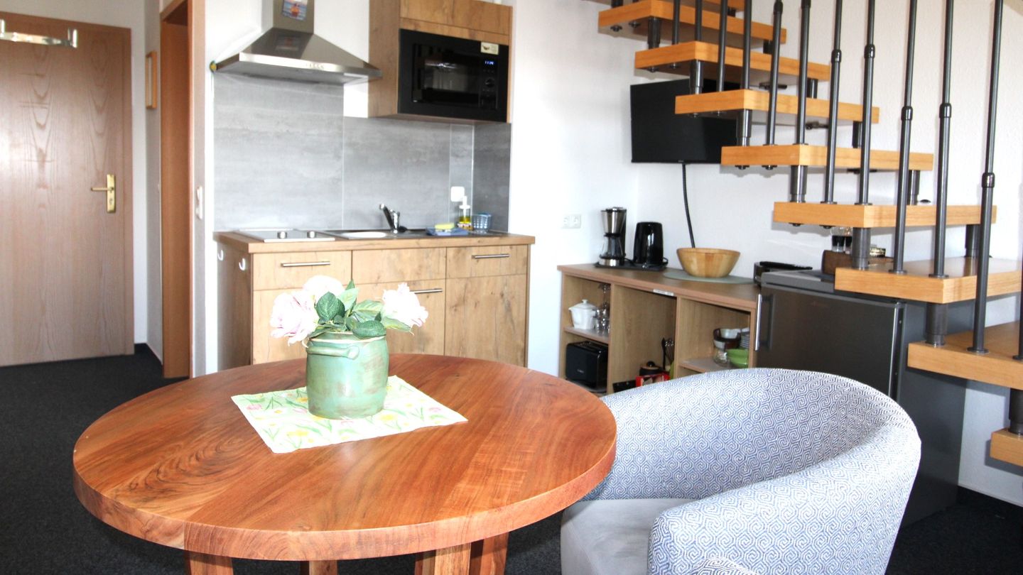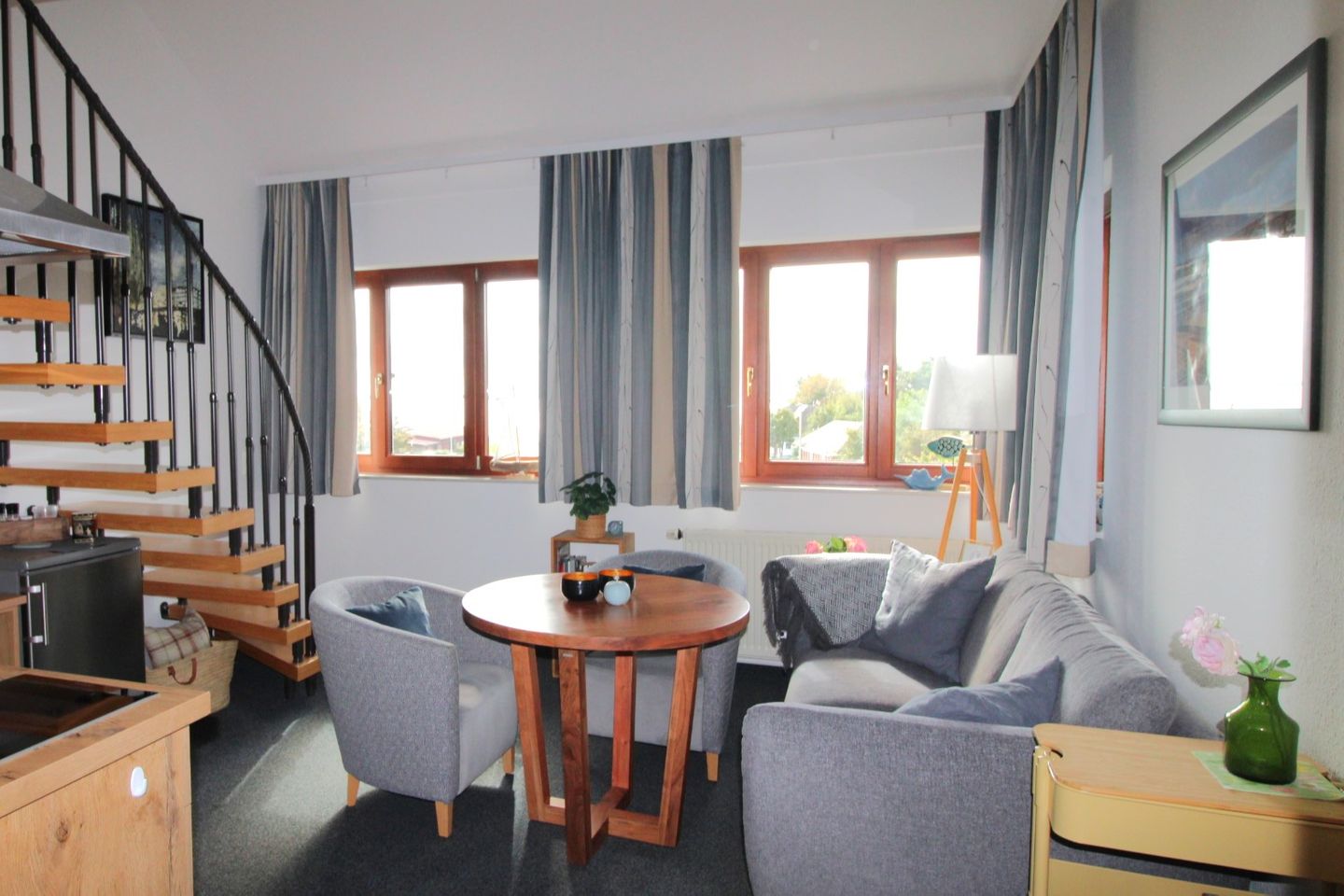 Das Maisonettappartement( Nr.38) befindet sich im zweiten Obergeschoss des Deutschen Hauses und ist für max. 3 Personen geeignet. Es verfügt über 1 Wohnraum im 1.OG mit integrierter Pantryküche und einen offenen Schlafraum mit einem Doppel und einem Einzelbett im DG, ein Bad mit Badewanne/WC. Zum Appartement gehört ein Westbalkon mit Blick auf den Bodden und den Hafen von Wustrow. Das Rauchen ist hier untersagt. Das W-Lan im Haus steht kostenlos zur Verfügung. Die kostenfreien Parkplätze können je nach Verfügbarkeit genutzt werden.